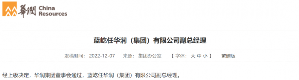 12月7日,經(jīng)上級決定,華潤集團董事會通過,藍(lán)屹任華潤(集團)有限公司副總經(jīng)理。