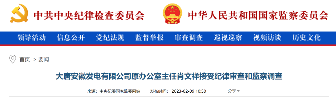 中央紀委國家監(jiān)委網(wǎng)站訊2月9日消息,據(jù)中國大唐集團有限公司紀檢監(jiān)察組、安徽省監(jiān)察委員會消息:大唐安徽發(fā)電有限公司原辦公室主任肖文祥涉嫌嚴重違紀違法,目前正接受中國大唐集團有限公司紀檢監(jiān)察組紀律審查和安徽省淮北市監(jiān)察委員會監(jiān)察調查。