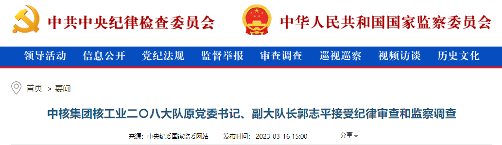 中央紀(jì)委國家監(jiān)委網(wǎng)站3月16日消息,中核集團核工業(yè)二〇八大隊原黨委書記、副大隊長郭志平涉嫌嚴(yán)重違紀(jì)違法,目前正接受中核集團紀(jì)檢監(jiān)察組和內(nèi)蒙古自治區(qū)烏海市監(jiān)委紀(jì)律審查和監(jiān)察調(diào)查。