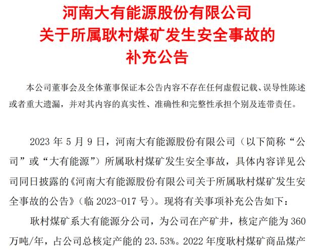 公告顯示,耿村煤礦系大有能源分公司,為公司在產(chǎn)礦井,核定產(chǎn)能為 360 萬(wàn)噸/年,占公司總核定產(chǎn)能的 23.53%。2022 年度耿村煤礦商品煤產(chǎn) 量 287.45 萬(wàn)噸,營(yíng)業(yè)收入 13.22 億元,分別占公司同期商品煤產(chǎn)量 的 24.83%和營(yíng)業(yè)收入的 15.39%。2023 年第一季度耿村煤礦商品煤產(chǎn) 量 51.51 萬(wàn)噸,營(yíng)業(yè)收入 2.15 億元,分別占公司同期商品煤產(chǎn)量的 18.32%和營(yíng)業(yè)收入的 10.73%。目前,耿村煤礦正在組織實(shí)施停產(chǎn)救援,對(duì)公司造成的影響暫無(wú)法預(yù)測(cè)。公司將持續(xù)關(guān)注事故后續(xù)進(jìn)展并及時(shí)履行信息披露義務(wù),敬請(qǐng)廣大投資者注意投資風(fēng)險(xiǎn)。