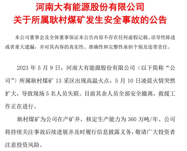 5月10日晚間大有能源公告,2023年5月9日,公司所屬耿村煤礦13采區(qū)出現(xiàn)高溫火點(diǎn),5月10日凌晨火情突然擴(kuò)大,導(dǎo)致現(xiàn)場(chǎng)5名人員失聯(lián)。目前其余人員全部安全撤離,救援工作正在進(jìn)行。