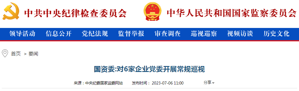 經(jīng)國(guó)資委黨委批準(zhǔn),2023年第一輪巡視對(duì)中國(guó)化學(xué)工程集團(tuán)有限公司、中國(guó)鐵路工程集團(tuán)有限公司、中國(guó)鐵道建筑集團(tuán)有限公司、中國(guó)交通建設(shè)集團(tuán)有限公司、中國(guó)電力建設(shè)集團(tuán)有限公司、中國(guó)能源建設(shè)集團(tuán)有限公司等6家企業(yè)黨委開展常規(guī)巡視。