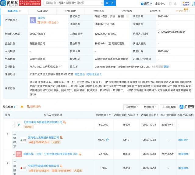 企查查APP顯示,近日,國(guó)能大良(天津)新能源有限公司成立,法定代表人為龐宏立,注冊(cè)資本2.5億元人民幣,經(jīng)營(yíng)范圍包含:風(fēng)電場(chǎng)相關(guān)系統(tǒng)研發(fā);電力行業(yè)高效節(jié)能技術(shù)研發(fā);節(jié)能管理服務(wù);合同能源管理等。企查查股權(quán)穿透顯示,該公司由國(guó)電電力(600795)、中國(guó)神華(601088)間接共同持股。