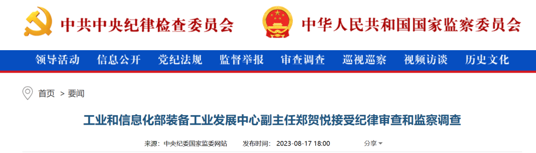 中央紀(jì)委國(guó)家監(jiān)委網(wǎng)站8月17日消息,據(jù)中央紀(jì)委國(guó)家監(jiān)委駐工業(yè)和信息化部紀(jì)檢監(jiān)察組、云南省紀(jì)委監(jiān)委消息:工業(yè)和信息化部裝備工業(yè)發(fā)展中心副主任鄭賀悅涉嫌嚴(yán)重違紀(jì)違法,目前正接受中央紀(jì)委國(guó)家監(jiān)委駐工業(yè)和信息化部紀(jì)檢監(jiān)察組紀(jì)律審查和云南省普洱市監(jiān)委監(jiān)察調(diào)查。