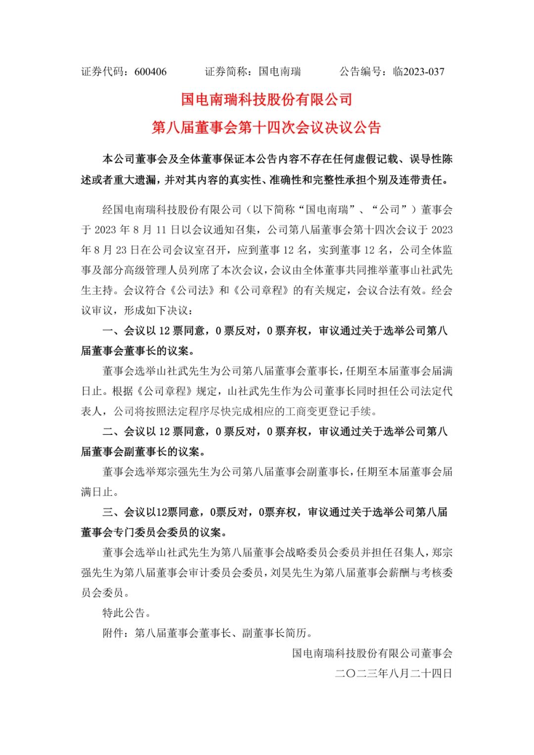 山社武任國(guó)電南瑞科技股份有限公司(以下簡(jiǎn)稱(chēng)“國(guó)電南瑞”)董事長(zhǎng),鄭宗強(qiáng)任國(guó)電南瑞副董事長(zhǎng)。