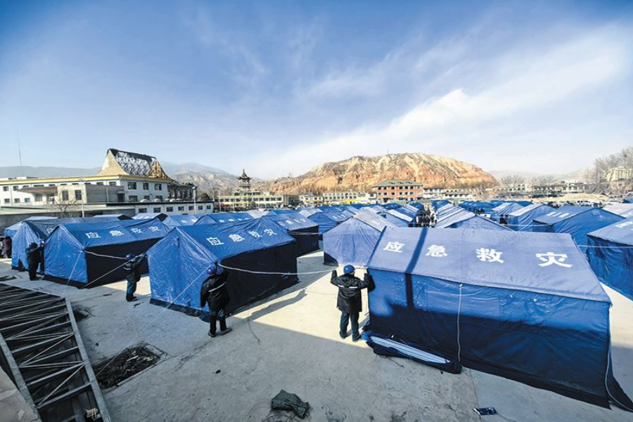 國(guó)網(wǎng)甘肅臨夏供電公司員工為積石山縣大河家鎮(zhèn)震區(qū)救治點(diǎn)帳篷接電。