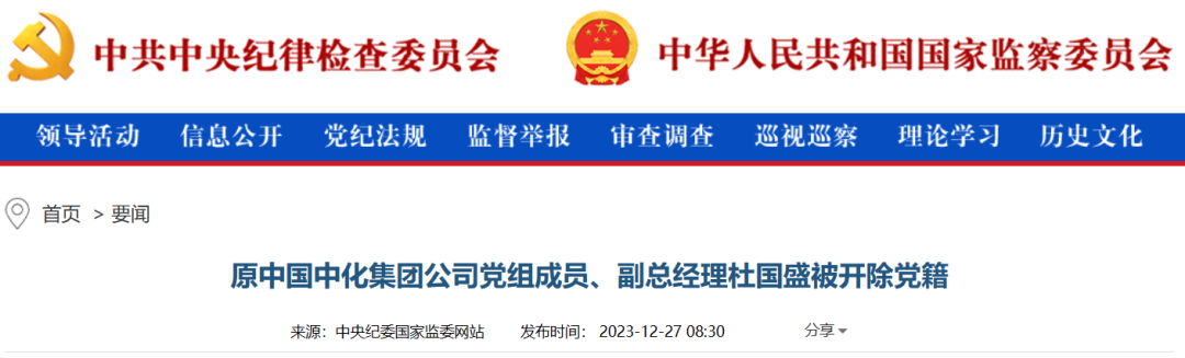 原中國(guó)中化集團(tuán)黨組成員、副總經(jīng)理杜國(guó)盛被開除黨籍