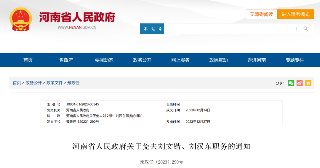12月27日,河南省政府發(fā)布通知稱(chēng),免去劉文鍇的華北水利水電大學(xué)校長(zhǎng)職務(wù);免去劉漢東的華北水利水電大學(xué)副校長(zhǎng)職務(wù)。
