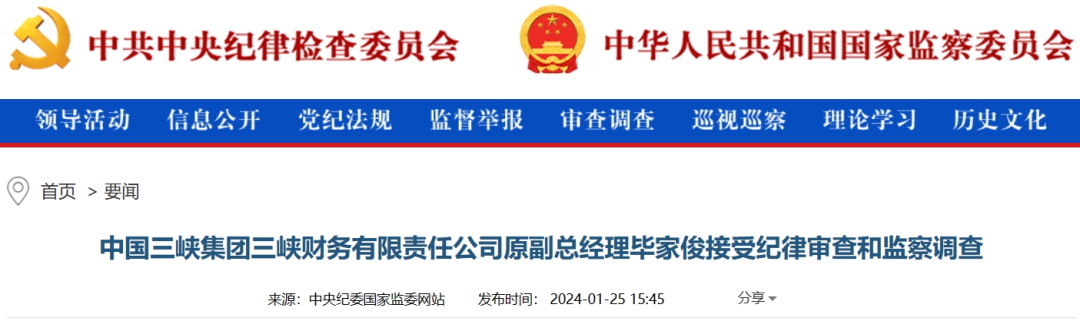 中央紀(jì)委國家監(jiān)委網(wǎng)站1月25日消息,據(jù)中國三峽集團(tuán)紀(jì)檢監(jiān)察組、湖北省紀(jì)委監(jiān)委消息:中國三峽集團(tuán)三峽財(cái)務(wù)有限責(zé)任公司原副總經(jīng)理畢家俊涉嫌嚴(yán)重違紀(jì)違法,目前正接受中國三峽集團(tuán)紀(jì)檢監(jiān)察組和湖北省天門市監(jiān)委紀(jì)律審查和監(jiān)察調(diào)查。