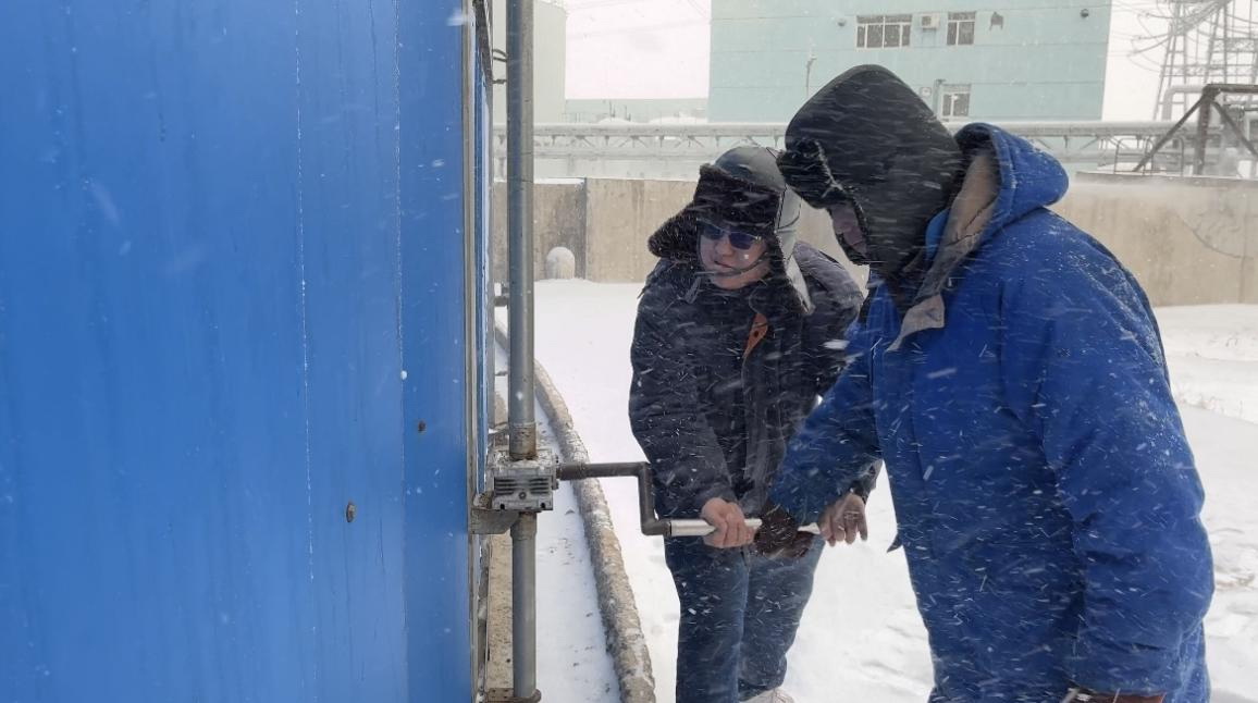 華能九臺電廠檢修人員冒雪調節(jié)循環(huán)水溫度