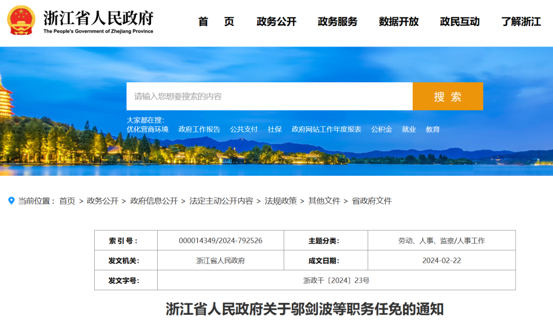 浙江省人民政府關于鄔劍波等職務任免的通知