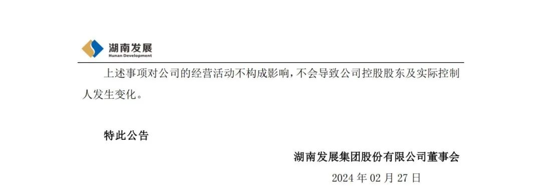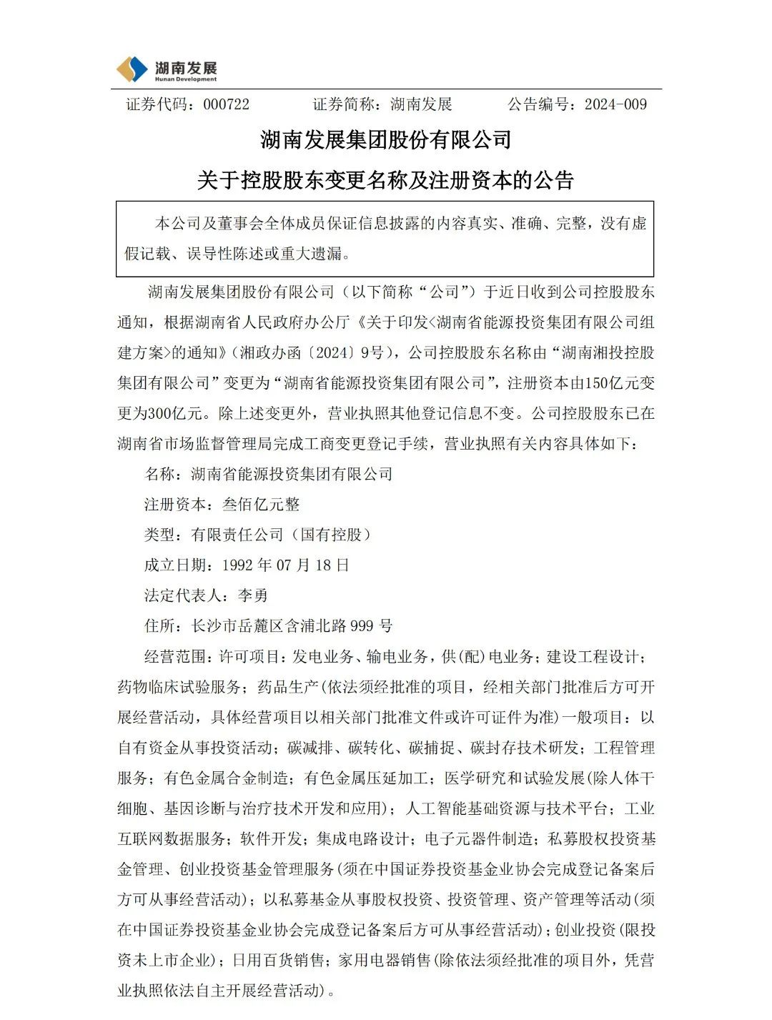 2月27日,湖南發(fā)展集團(tuán)股份有限公司發(fā)布關(guān)于控股股東變更名稱(chēng)及注冊(cè)資本的公告,公告顯示:湖南發(fā)展集團(tuán)股份有限公司于近日收到公司控股股東通知,根據(jù)湖南省人民政府辦公廳《關(guān)于印發(fā)<湖南省能源投資集團(tuán)有限公司組建方案>的通知》(湘政辦函〔2024〕9號(hào)),公司控股股東名稱(chēng)由“湖南湘投控股集團(tuán)有限公司”變更為“湖南省能源投資集團(tuán)有限公司”,注冊(cè)資本由150億元變更為300億元。除上述變更外,營(yíng)業(yè)執(zhí)照其他登記信息不變。公司控股股東已在湖南省市場(chǎng)監(jiān)督管理局完成工商變更登記手續(xù)。