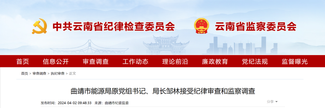 據(jù)曲靖市紀(jì)委監(jiān)委消息:曲靖市能源局原黨組書(shū)記、局長(zhǎng)鄒林涉嫌嚴(yán)重違紀(jì)違法,主動(dòng)投案,目前正接受曲靖市紀(jì)委監(jiān)委紀(jì)律審查和監(jiān)察調(diào)查。
