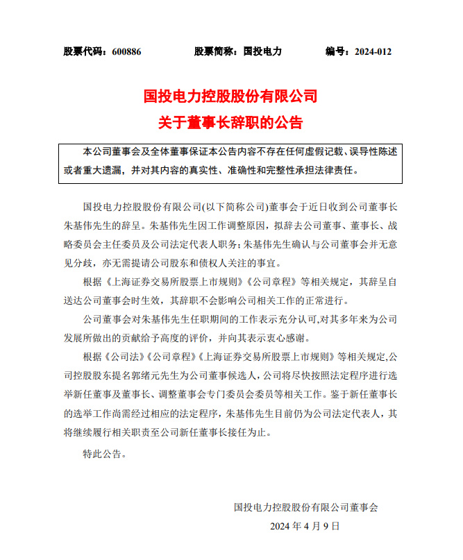 4月9日,國投電力發(fā)布公告稱,公司董事會于近日收到公司董事長朱基偉先生的辭呈。朱基偉先生因工作調(diào)整原因,擬辭去公司董事、董事長、戰(zhàn)略委員會主任委員及公司法定代表人職務;朱基偉先生確認與公司董事會并無意見分歧,亦無需提請公司股東和債權(quán)人關注的事宜。