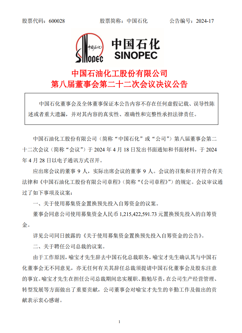 4月29日,中國石化發(fā)布公告稱,由于工作原因,喻寶才先生辭去中國石化總裁職務。董事會聘任趙東先生為中國石化總裁,同時調(diào)整為執(zhí)行董事,聘期自董事會批準之日起至第八屆董事會任期屆滿時止。
