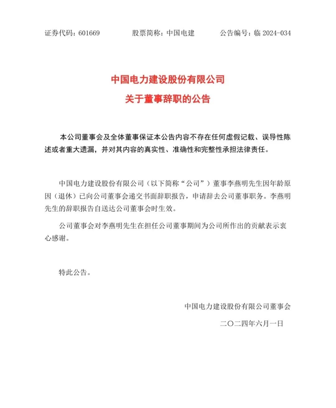 6月1日,中國電建發(fā)布公告稱,公司董事李燕明先生因年齡原因(退休)已向公司董事會遞交書面辭職報告,申請辭去公司董事職務(wù)。李燕明先生的辭職報告自送達(dá)公司董事會時生效。