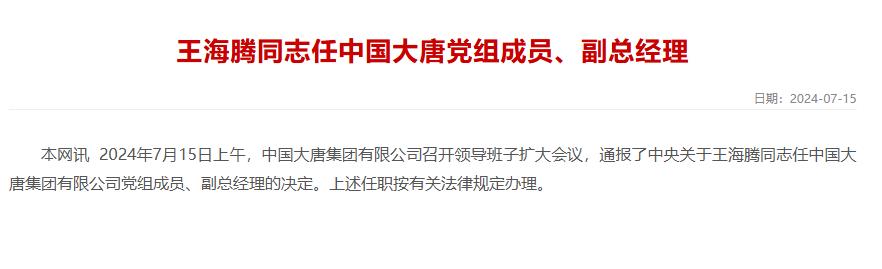 據(jù)大唐集團官網(wǎng)消息,2024年7月15日上午,中國大唐集團有限公司召開領(lǐng)導(dǎo)班子擴大會議,通報了中央關(guān)于王海騰同志任中國大唐集團有限公司黨組成員、副總經(jīng)理的決定。上述任職按有關(guān)法律規(guī)定辦理。