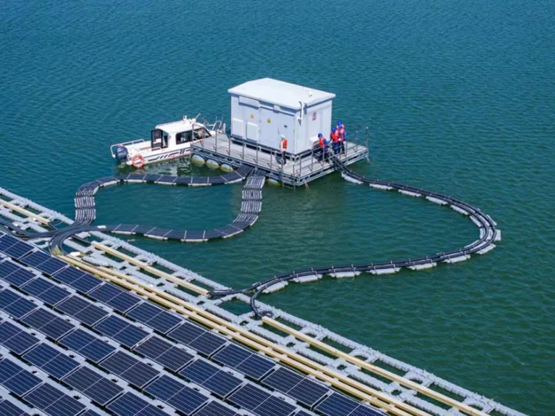 國網(wǎng)山東電力員工在世界單體最大水上漂浮式光伏電站協(xié)助用戶開展設(shè)備運(yùn)行維護(hù)。