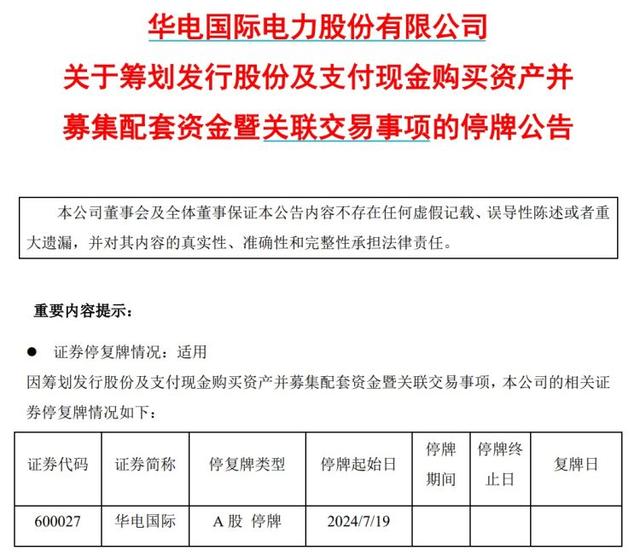 7月18日晚間,華電國際一紙公告宣布,該公司收到控股股東中國華電集團有限公司(以下簡稱華電集團)通知,擬籌劃與公司有關(guān)的資產(chǎn)重組事項,其股票于7月19日停牌。