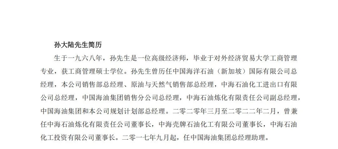 二零二零年三月至二零二二年二月,曾兼任中海石油煉化有限責(zé)任公司董事長,中海殼牌石油化工有限公司董事長,中海石油化工投資有限公司董事長。二零一七年九月起,任中國海油集團(tuán)總經(jīng)理助理。