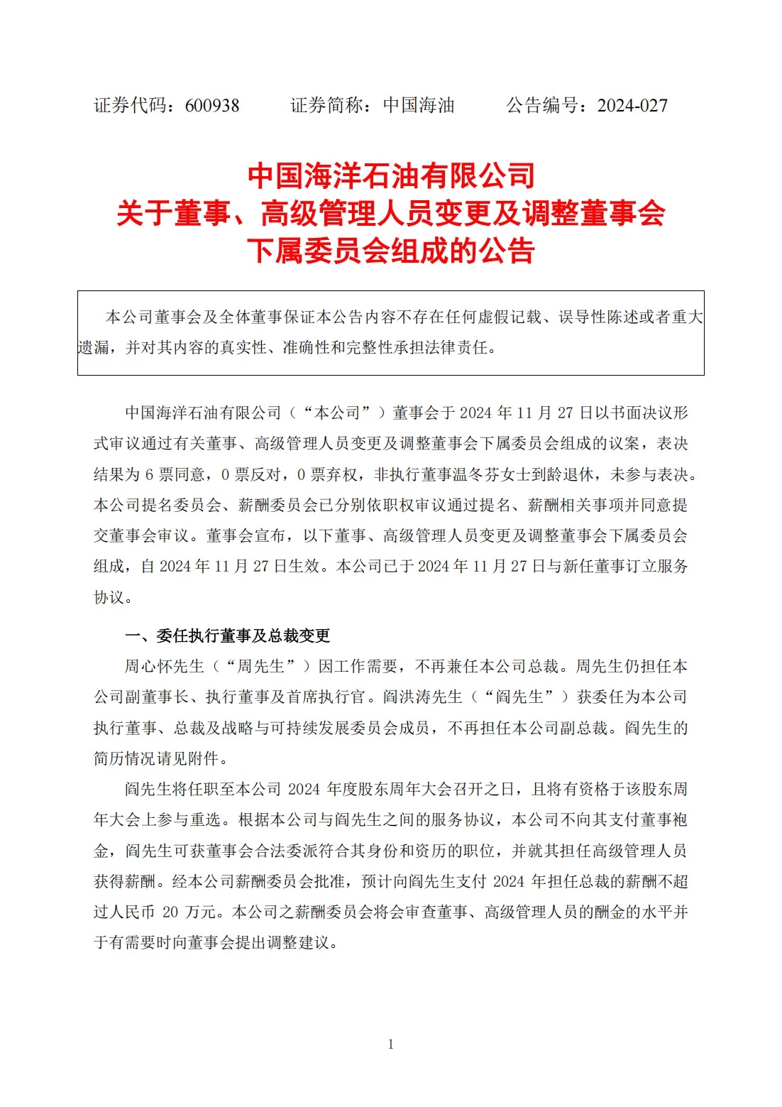 11月27日,中國海洋石油有限公司發(fā)布《關(guān)于董事、高級管理人員變更及調(diào)整董事會下屬委員會組成的公告》: