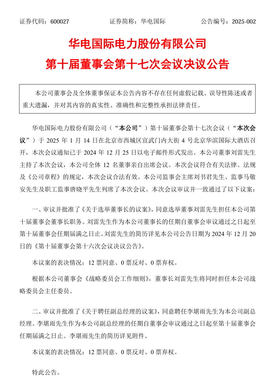 華電國(guó)際發(fā)布公告稱,公司第十屆董事會(huì)第十七次會(huì)議于1月14日召開。會(huì)議審議并批準(zhǔn)了《關(guān)于選舉董事長(zhǎng)的議案》,同意選舉董事劉雷先生擔(dān)任本公司第十屆董事會(huì)董事長(zhǎng)職務(wù)。劉雷先生作為本公司董事長(zhǎng)的任期自董事會(huì)審議通過(guò)之日起至第十屆董事會(huì)任期屆滿之日止。