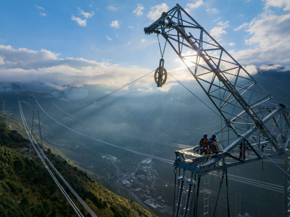 2024年10月15日,施工人員在國家電網(wǎng)川渝1000千伏特高壓交流工程進行收緊導(dǎo)線作業(yè)