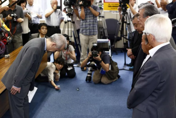 2013年8月29日,在日本東京,日本東京電力公司社長廣瀨直己(左)向全國漁業(yè)協(xié)會(huì)聯(lián)合會(huì)的代表鞠躬道歉。日本福島第一核電站先前曝出儲(chǔ)水罐放射性污水大量泄漏事件,引發(fā)日本漁業(yè)團(tuán)體擔(dān)憂和抗議。新華社/法新