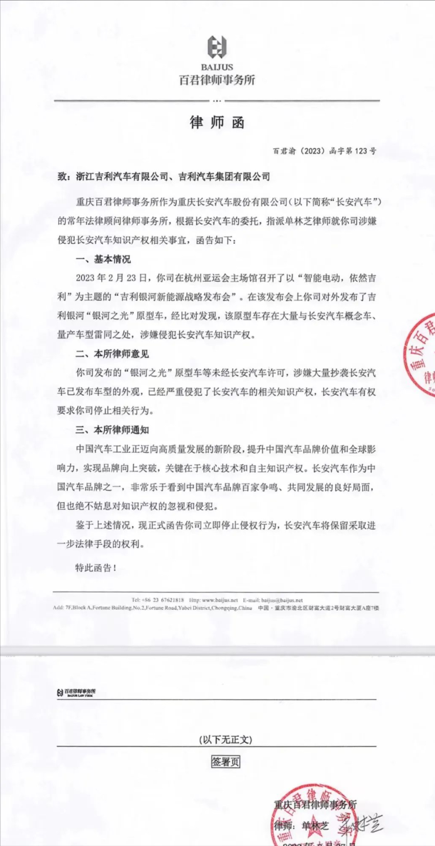 然而,時隔不到一周時間,“吉利銀河”便迎來抄襲質(zhì)疑。2月28日,長安汽車方面的委托律師事務(wù)所——重慶百君律師事務(wù)所發(fā)送的律師函,指出吉利銀河“銀河之光”原型車,存在大量與長安汽車概念車、量產(chǎn)車型雷同之處,涉嫌大量抄襲長安汽車已發(fā)布車型的外觀,已經(jīng)嚴重侵犯了長安汽車的相關(guān)知識產(chǎn)權(quán)。