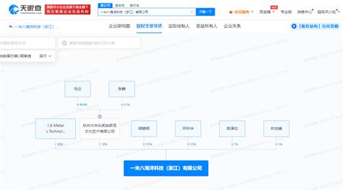 股權(quán)全景穿透圖顯示,該公司由1.8Meters Technology Holding Limited、杭州大井頭貳拾貳號文化藝術(shù)有限公司以及胡曉明等4名自然人共同持股。其中,杭州大井頭貳拾貳號文化藝術(shù)有限公司由馬云持股99.9%;持有一米八海洋科技5.5%股權(quán)并擔(dān)任董事長的胡曉明則曾任螞蟻集團(tuán)CEO。