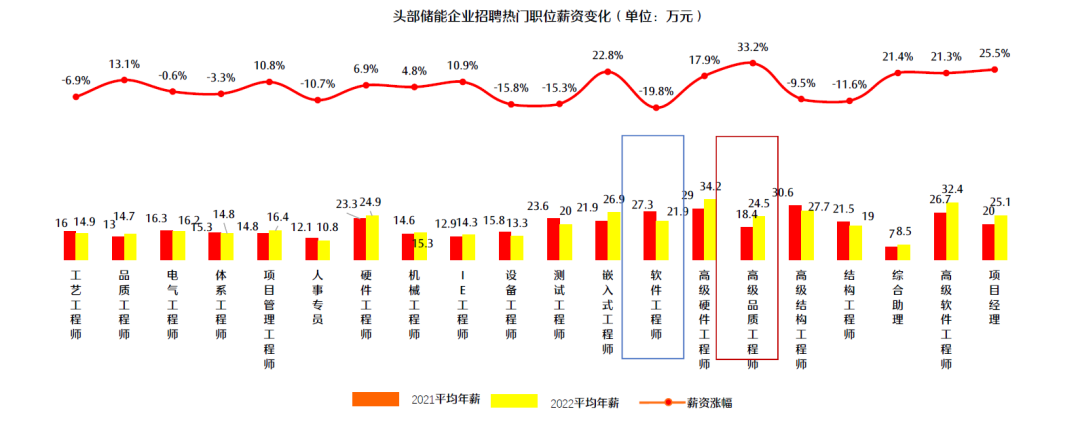 此外,在行業(yè)排名靠前的儲(chǔ)能企業(yè)中,以“高級(jí)品質(zhì)工程師”在2022年的漲薪幅度最大,平均漲薪33.2%;其次是“項(xiàng)目經(jīng)理”和“嵌入式開發(fā)工程師”,分別漲薪25.5%和22.8%。