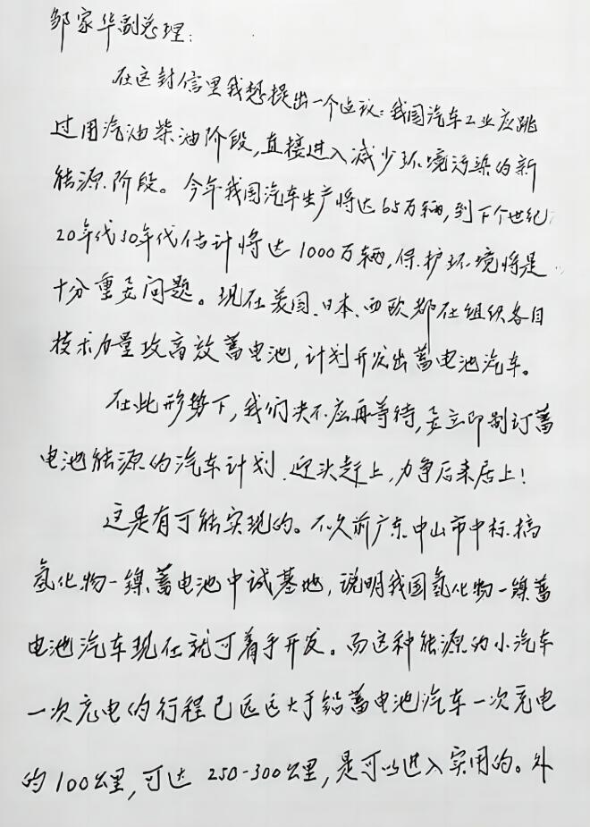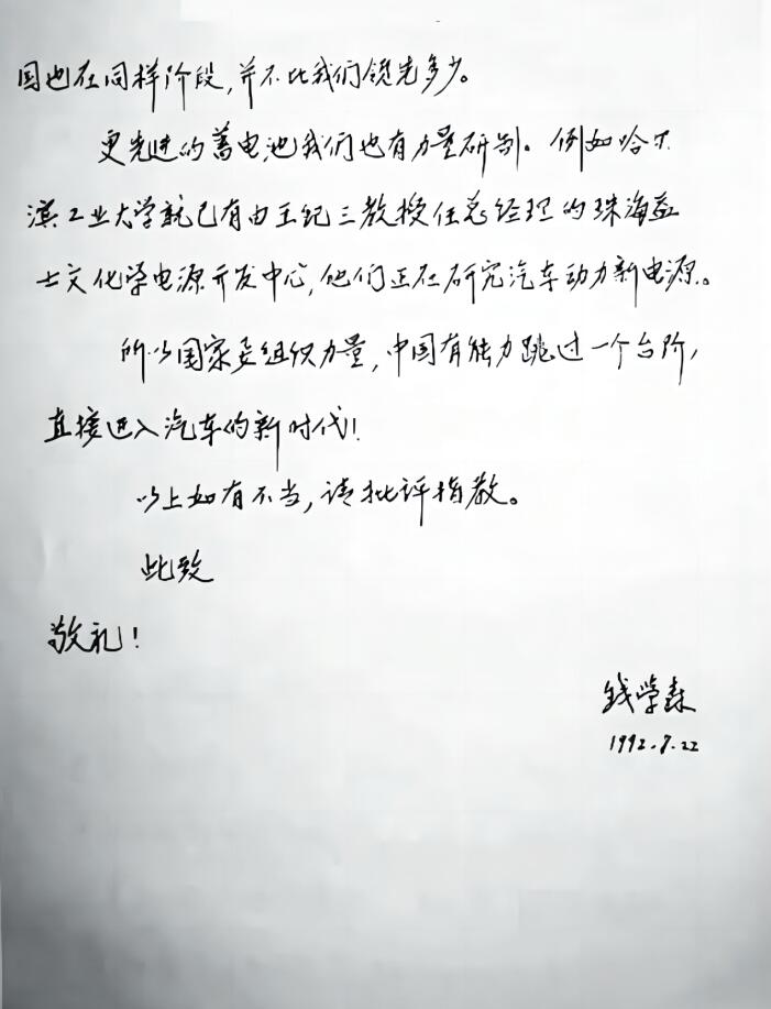 1992年,當時已81歲高齡的錢學(xué)森寫信給時任副總理鄒家華,提出了一個高瞻遠矚的建議:“我國汽車工業(yè)應(yīng)跳過用汽油柴油階段,直接進入減少環(huán)境污染的新能源階段……到下個世紀20年代保護環(huán)境將是十分重要問題?,F(xiàn)在美國、日本、西歐都在組織各自技術(shù)力量攻高效蓄電池,計劃開發(fā)出蓄電池汽車。”