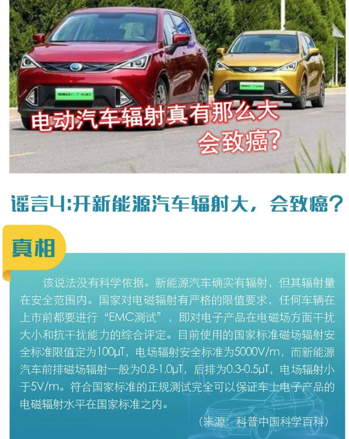 近日,中國(guó)互聯(lián)網(wǎng)聯(lián)合辟謠平臺(tái)發(fā)布《2023年新能源汽車行業(yè)辟謠榜》,其中針對(duì)網(wǎng)上流傳的“開新能源汽車輻射大、會(huì)致癌”說法進(jìn)行了權(quán)威辟謠。