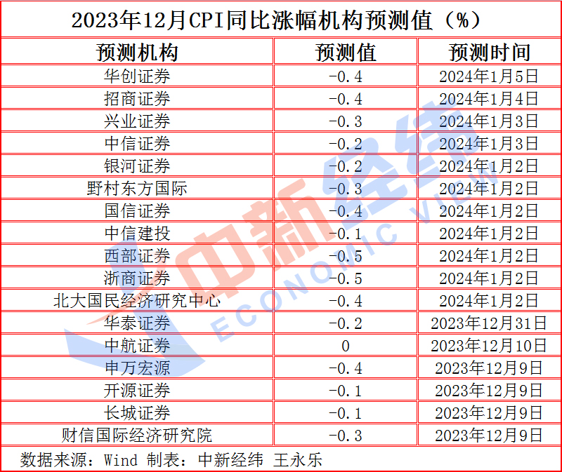 對(duì)于即將揭曉的2023年12月CPI數(shù)據(jù),Wind數(shù)據(jù)顯示,截至1月11日,17家機(jī)構(gòu)對(duì)12月CPI同比漲幅的預(yù)測(cè)均值為-0.3%。從預(yù)測(cè)值來(lái)看,1家為0%,9家在-0.3%~-0.1%區(qū)間,5家為-0.4%,2家為-0.5%,預(yù)測(cè)值最高為中航證券給出的0%,最低為西部證券、浙商證券給出的-0.5%。若按照機(jī)構(gòu)預(yù)測(cè)的均值計(jì)算,CPI同比降幅將收窄,且連續(xù)三個(gè)月處于負(fù)值區(qū)間。