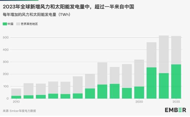 報(bào)告重點(diǎn)分析了中國(guó)的情況:中國(guó)在推進(jìn)全球能源轉(zhuǎn)型中扮演著舉足輕重的角色。中國(guó)是風(fēng)力和太陽(yáng)能發(fā)電的全球領(lǐng)導(dǎo)者,擁有十多年來最大的絕對(duì)發(fā)電量和最高的年增加量。其以極快的速度增加風(fēng)力和太陽(yáng)能發(fā)電量,改變?nèi)蜃畲蟮碾娏ο到y(tǒng)。僅2023年,中國(guó)就貢獻(xiàn)了全球一半以上的新增風(fēng)能和太陽(yáng)能發(fā)電量,占全球太陽(yáng)能和風(fēng)能發(fā)電量的37%。