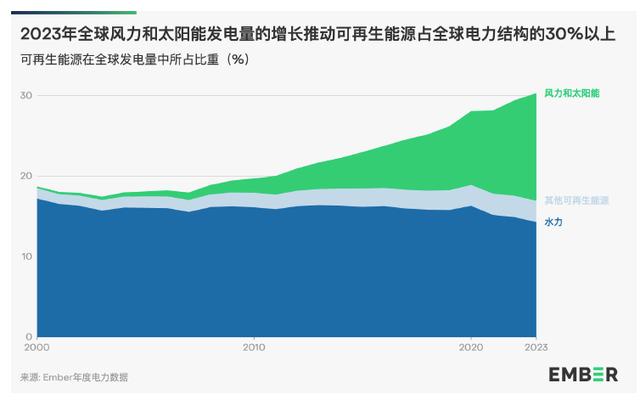 5月8日,根據(jù)全球能源智庫(kù)Ember的最新報(bào)告:2023 年,得益于太陽(yáng)能和風(fēng)力發(fā)電量的增長(zhǎng),可再生能源發(fā)電量在全球發(fā)電量中的占比達(dá)到了前所未有的30%。2023年或?qū)⒊蔀殡娏π袠I(yè)碳排放量達(dá)到峰值的標(biāo)志性轉(zhuǎn)折點(diǎn)。