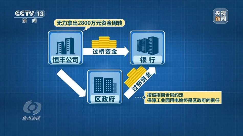 而為了解押,恒豐公司需要提供一筆過橋資金給抵押貸款的銀行,待土地分割手續(xù)辦完后,銀行再繼續(xù)發(fā)放貸款。這時候,恒豐公司由于長期沒有正式生產,無力拿出2800萬元資金周轉,請區(qū)政府協(xié)調一筆過橋資金,因為按照招商合同約定,保障工業(yè)園用電始終是區(qū)政府的責任。