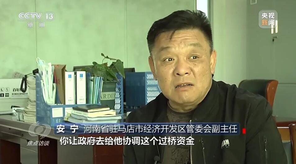 河南省駐馬店市經濟開發(fā)區(qū)管委會副主任安寧:過橋資金2800萬,他自己拿不起,讓政府協(xié)調過橋資金,政府又為了免于擔風險,幾經努力,最后這個事沒有做成。說是為了免擔風險,區(qū)政府沒有幫助協(xié)調下過橋資金,但是,也沒有履行確保恒豐公司用電負荷的約定。當?shù)亟o產業(yè)園提供的一直是建設廠房時的臨時用電,220千伏變電站沒有如期建成,對企業(yè)造成的影響,當?shù)卣质侨绾慰创哪?河南省駐馬店市經濟開發(fā)區(qū)管委會副主任安寧:電力接上了,是臨時用電,建設期都給接了。記者:電力保障在前,還是應該生產在前?河南省駐馬店市經濟開發(fā)區(qū)管委會副主任安寧:電力保障在前。記者:正式用電的電力保障一直沒有進行的原因是什么呢?河南省駐馬店市經濟開發(fā)區(qū)管委會副主任安寧:這個你要問當事人。