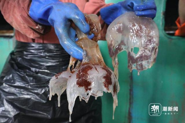 “抓海蜇的第一個小時還有點新鮮感,第二小時就不行了,腿酸。濾網(wǎng)時不時會有海水濺出來,整個人全部濕掉,又腥又臭。等到最后值班時間結(jié)束,雙腿沉得不像自己的。”有過來人這么形容和海蜇“戰(zhàn)斗”的感受。