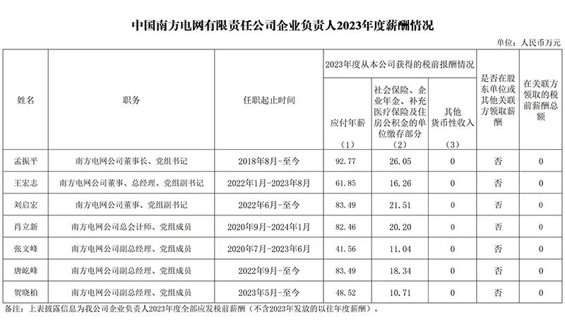 中國南方電網(wǎng)有限責(zé)任公司企業(yè)負(fù)責(zé)人2023年度薪酬情況的表格詳細(xì)列出了幾位高層管理人員的姓名、職務(wù)、任職起止時(shí)間以及他們的薪酬構(gòu)成。