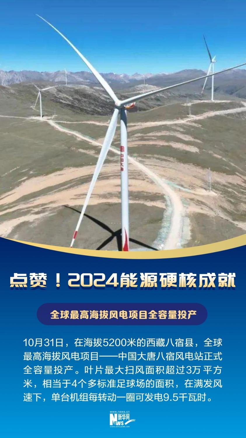 10月31日,在海拔5200米的西藏昌都市八宿縣,全球最高海拔風電項目——中國大唐八宿風電站正式全容量投產(chǎn)。項目共安裝20臺風電機組,風機輪轂中心高度110米,葉輪直徑195米,葉片最大掃風面積超過3萬平方米,相當于4個多標準足球場的面積,在滿發(fā)風速下,單臺機組每轉(zhuǎn)動一圈可發(fā)電9.5千瓦時。