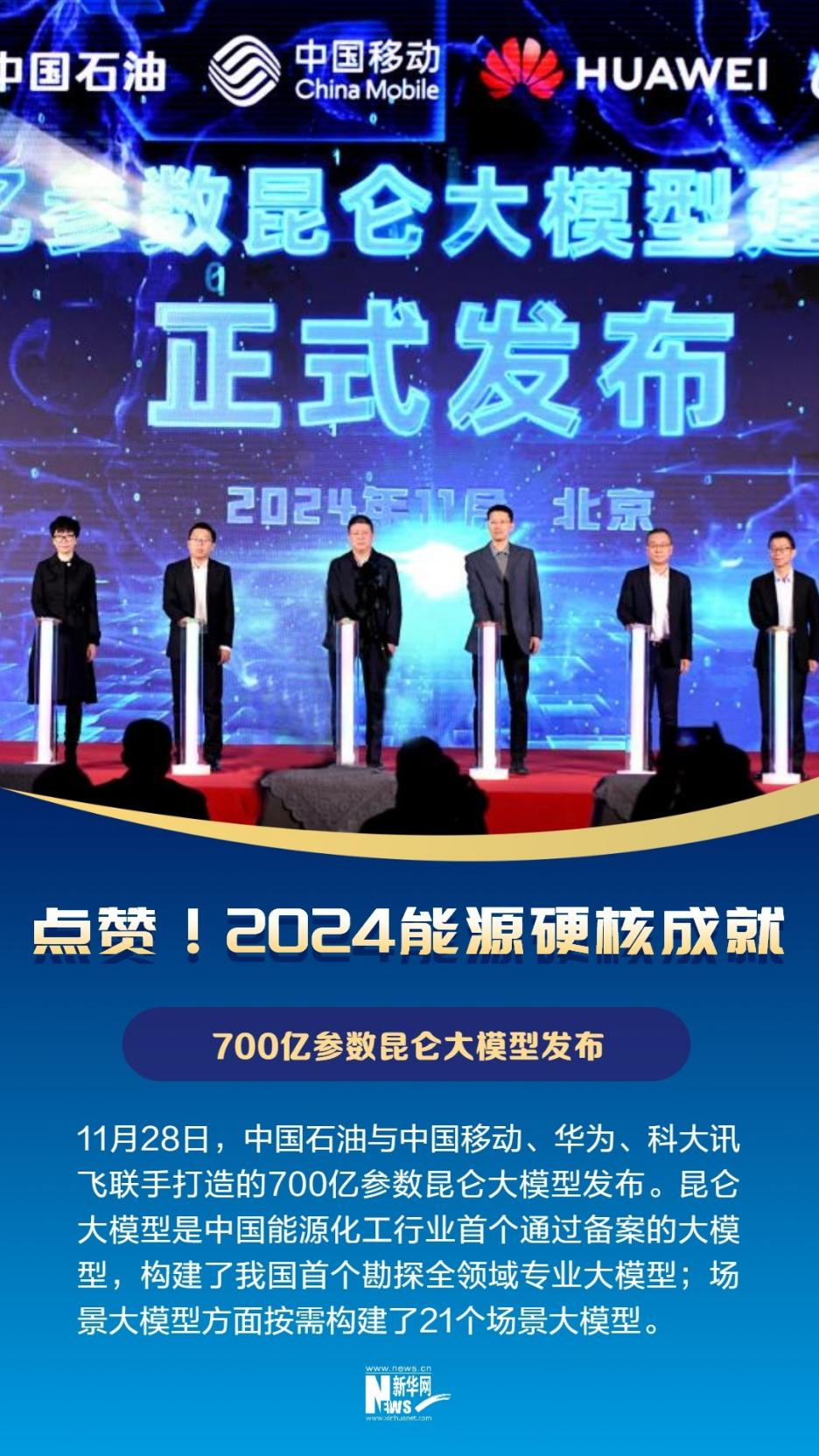 11月28日,中國石油與中國移動、華為、科大訊飛聯(lián)手打造的700億參數(shù)昆侖大模型發(fā)布。昆侖大模型是中國能源化工行業(yè)首個通過備案的大模型,于2024年5月正式啟動建設,3個月后參數(shù)量級達到330億。此次發(fā)布的昆侖大模型,在行業(yè)大模型方面參數(shù)從330億升級到700億,自然語言處理、語音視覺識別、多模態(tài)交互、科學計算等專業(yè)能力大幅提升,視覺大模型訓練數(shù)據(jù)進一步豐富;在專業(yè)大模型方面構(gòu)建了我國首個勘探全領域?qū)I(yè)大模型;場景大模型方面按需構(gòu)建了21個場景大模型。