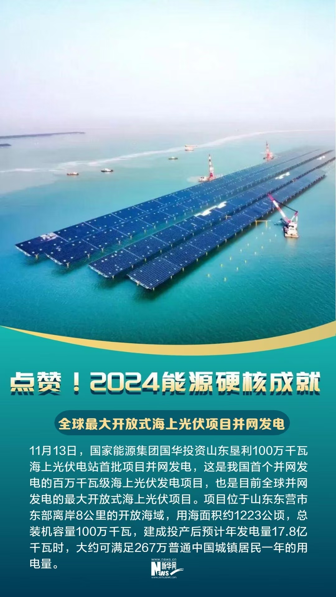 11月13日,國家能源集團國華投資山東墾利100萬千瓦海上光伏電站首批項目并網(wǎng)發(fā)電,這是我國首個并網(wǎng)發(fā)電的百萬千瓦級海上光伏發(fā)電項目,也是目前全球并網(wǎng)發(fā)電的最大開放式海上光伏項目。項目位于山東東營市東部離岸8公里的開放海域,用海面積約1223公頃,總裝機容量100萬千瓦,建成投產(chǎn)后預計年發(fā)電量17.8億千瓦時,大約可滿足267萬普通中國城鎮(zhèn)居民一年的用電量。