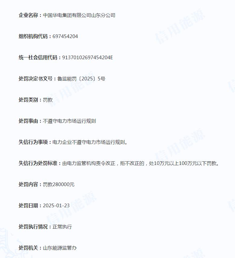 日前,信用能源公布了對中國華電集團有限公司山東分公司的行政處罰決定,魯監(jiān)能罰〔2025〕5號處罰決定書文號顯示,中國華電集團有限公司山東分公司不遵守電力市場運行規(guī)則,山東能源監(jiān)管辦對其作出罰款280000元處罰。