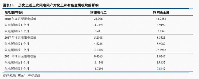 限電限產給化工和大宗商品的短期供需關系造成了直接的影響。在限電限產矛盾較為突出時段,往往化工和有色金屬板塊出現(xiàn)了明顯的上漲,但在限電緩解后,拉長看,化工和有色金屬板塊均會出現(xiàn)不同程度上的下跌。