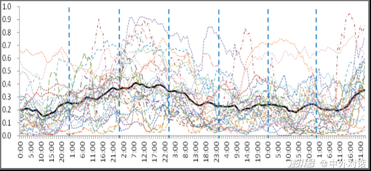 如下圖所示,單一省份(圖中彩色線條)的風電出力在不同時段波動較大,但當在更大地理范圍做耦合,比如放眼“三北”及華中華東區(qū)域,整體風電出力曲線實現(xiàn)平滑,新能源可以得到更好的消納。