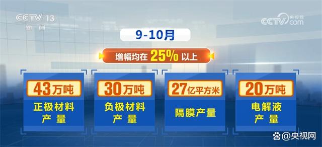 據(jù)了解,今年以來,我國鋰電池生產(chǎn)各環(huán)節(jié)均保持高位增長。9—10月,正極材料、負(fù)極材料、隔膜、電解液產(chǎn)量分別達(dá)到43萬噸、30萬噸、27億平方米、20萬噸,增幅均在25%以上。
