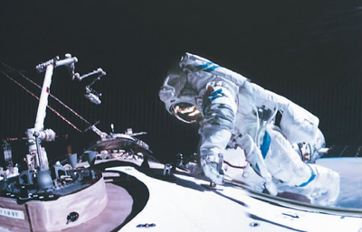 12月21日在北京航天飛行控制中心拍攝的神舟十七號(hào)航天員唐勝杰開(kāi)展艙外操作的畫(huà)面。(新華社發(fā))