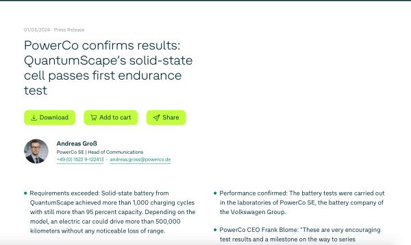 而1月3日,大眾集團(tuán)的電池子公司 PowerCo也發(fā)布了對(duì)QuantumScape 這批24 層固態(tài)電池A樣品的耐久性測試的結(jié)果報(bào)告,確認(rèn)了QuantumScape的聲明。