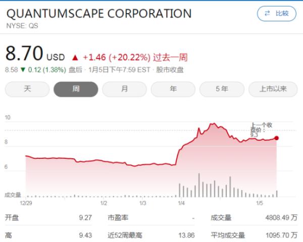 此次其固態(tài)電池通過大眾集團(tuán)方面耐久性測試的消息公布后第二日,QuantumScape股上漲 43%,收于 9.30 美元,創(chuàng)下 8 月以來的最高收盤價(jià)。盤中上漲約54%。該股在過去52周內(nèi)上漲了 72%,但較 2020 年 12 月創(chuàng)下的歷史高點(diǎn)下跌 93%。
